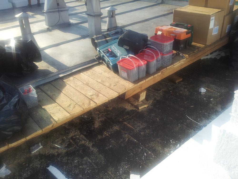 Kompletní rekonstrukce střešního pláště. Provedena demontáž druhého střešního pláště z dřevěných hranolů, bednění a falcované krytiny. Lokální vyspravení původního střešního pláště. Montáž nové hydroizolační fólie DEKPLAN 76 tl. 1,5 mm vč. zateplení polystyrenem z rovných desek EPS 100 S tl. 140 mm a spádových klínu z EPS 100 S tl. 20-160 mm. Zateplení svislé části atiky polystyrenem EPS 100 S t. 80 mm a zteplení a přespádování koruny atiky polystyrenem XPS FIBRAN 300 L tl. 80 mm a deskou OSB 3 tl. 15 mm vč. oplechování z poplastovaného plechu VIPLANYL.