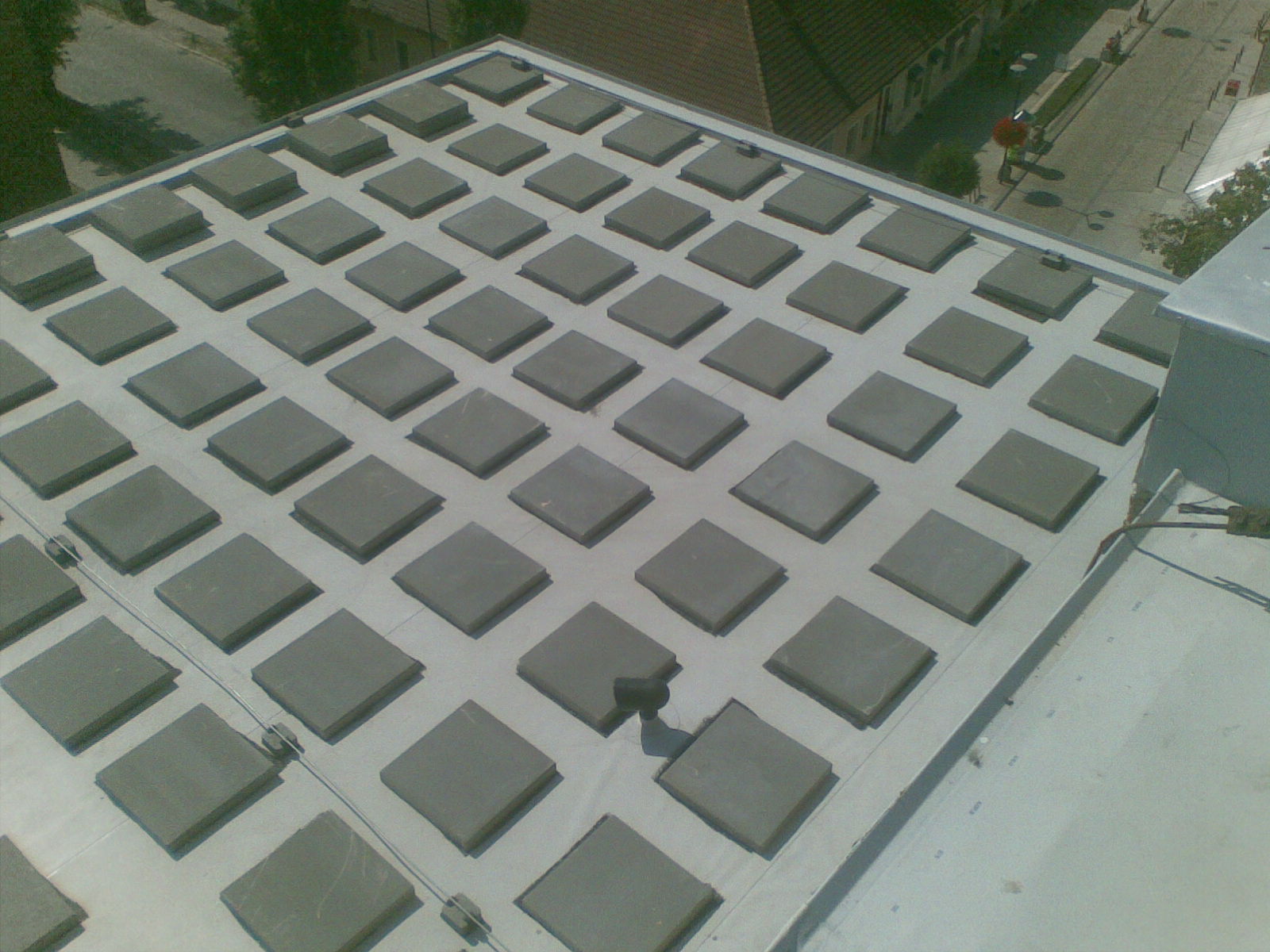 Pokládka tepelné izolace z pěnového polystyrenu EPS 70 S tl. 100 mm a EPS 100 S tl. 60 mm (s posunutím spar). Pokládka separační vrstvy z polypropylenových vláken FILTEK 300 g/m2 a provedení povlakové izolace z PVC fólie ALKORPLAN 35177 tl. 1,5 mm. Stabilizace střešního pláště přitížením betonovou dlažbou. Provedení klempířských prvků z plechu Viplanyl a Pz vč. nátěrů stávajících kovových konstrukcí.