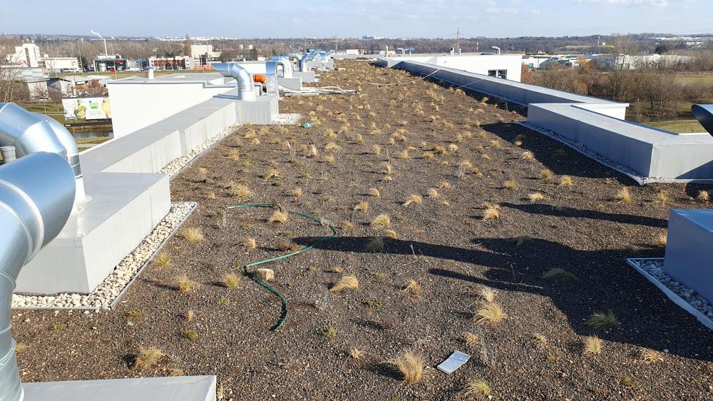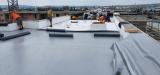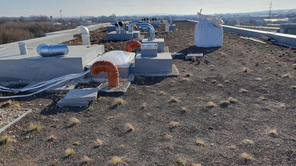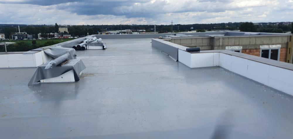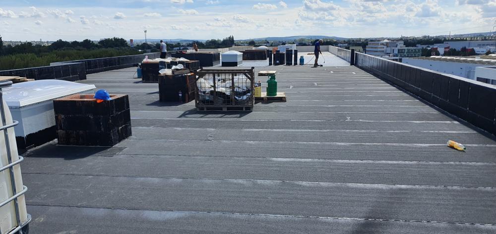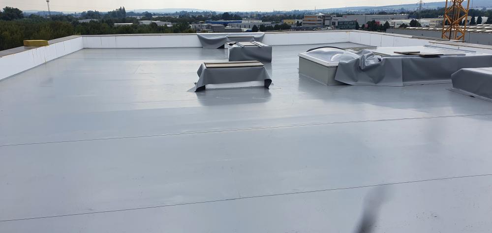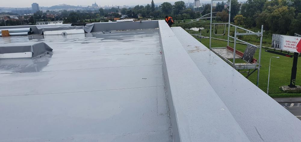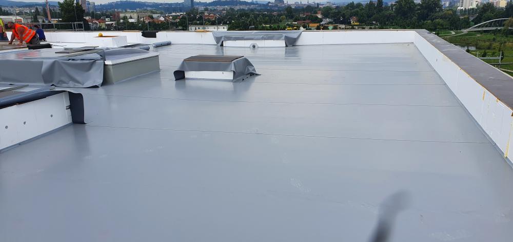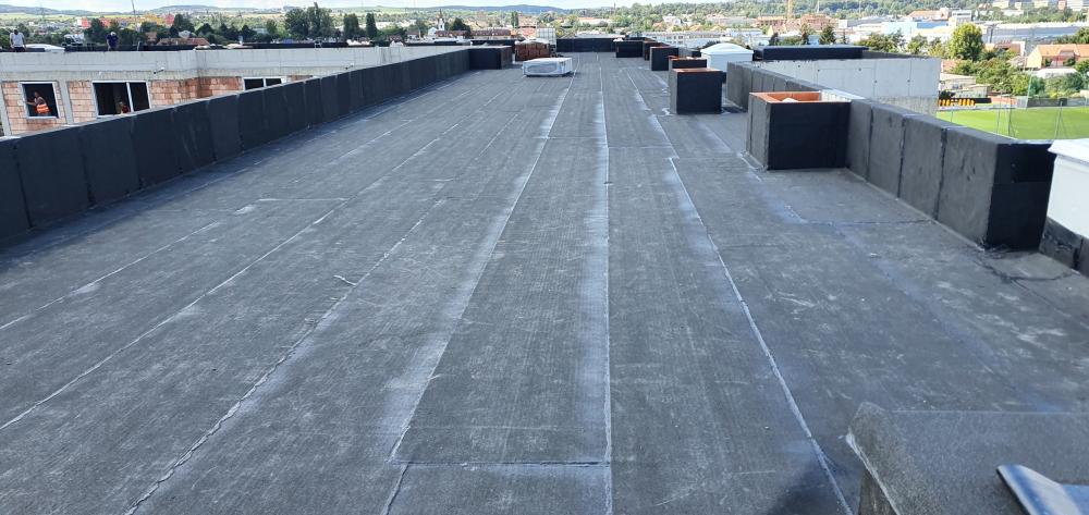Provedení parotěsné zábrany z SBS modifikovaného asfaltového pásu BITU-FLEX AL 4, položení tepelné izolace z rovných desek a spádových klínů z polystyrenu EPS 150, pokládka hydroizolační fólie z mPVC RHENOFOL CG tl. 1,5 mm vč. separační geotextílie GEOTEK 300 g/m2.