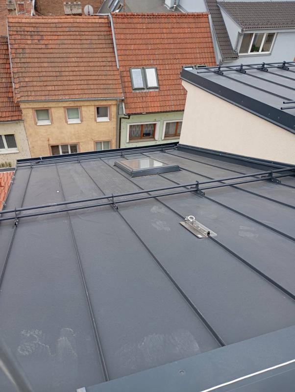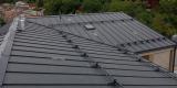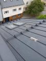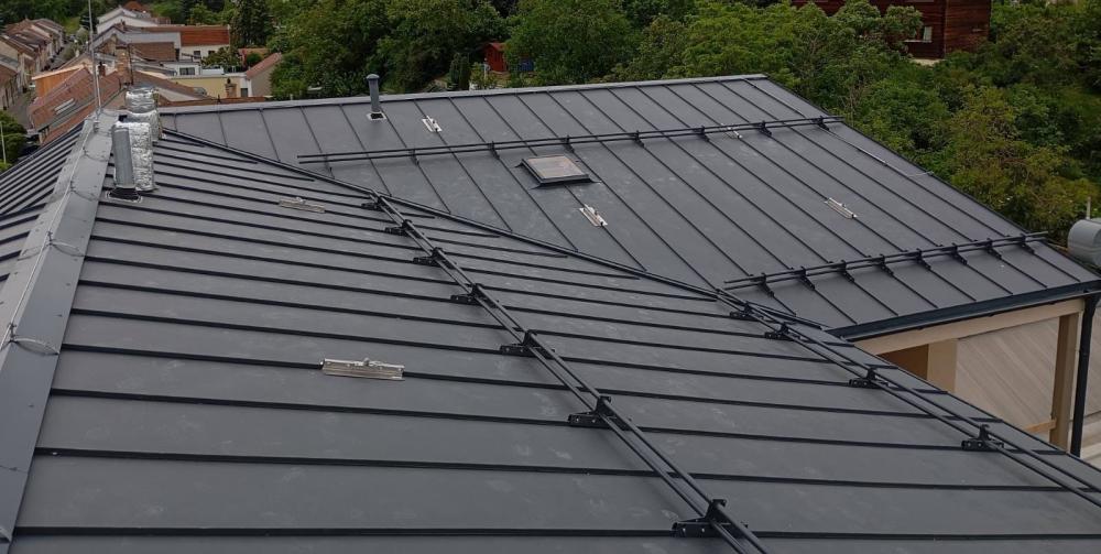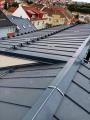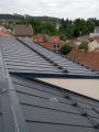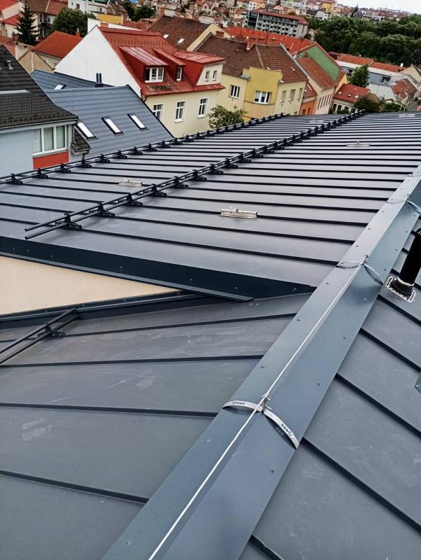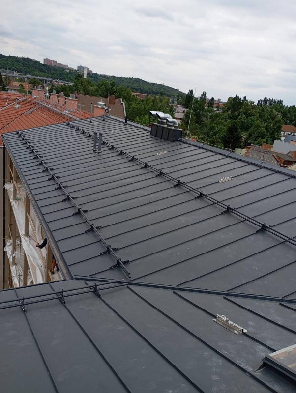 Konstrukce střechy provedena s dřevěných hranolů s difúzní fólií PHV LINDAB 140 a střešní plechovou krytinou LINDAB SRP Click 25 DN v povrchové úpravě Elite MATNÁ v odstínu Břidlicově šedá (č. barvy Lindab 035 – nejbližší RAL 7016), kladenou na celoplošné bednění.