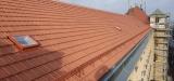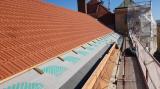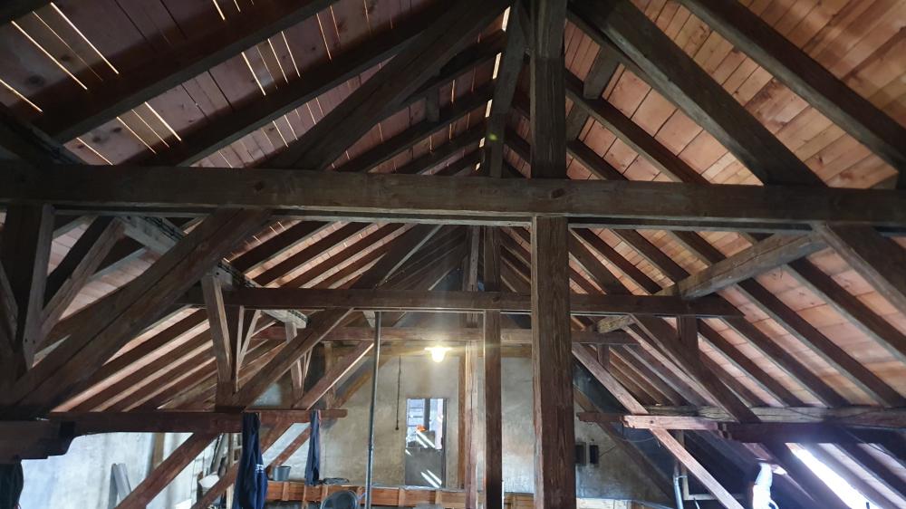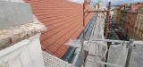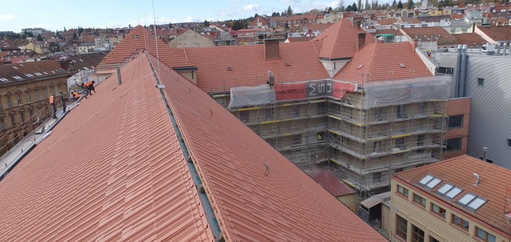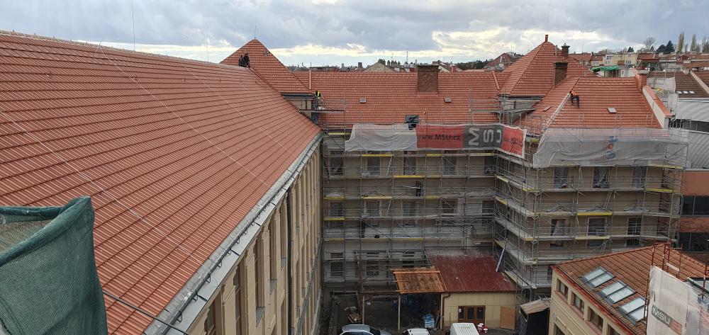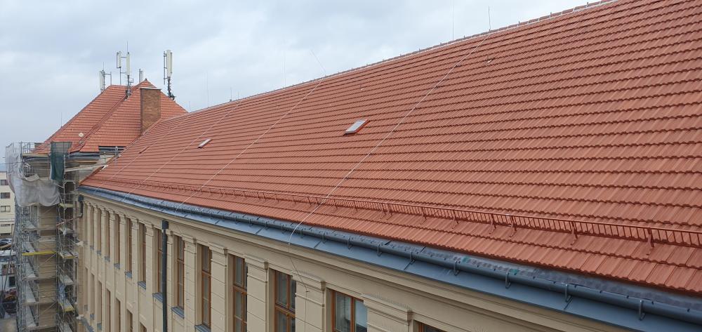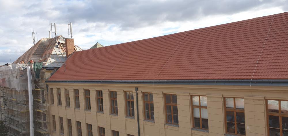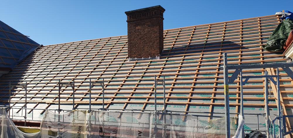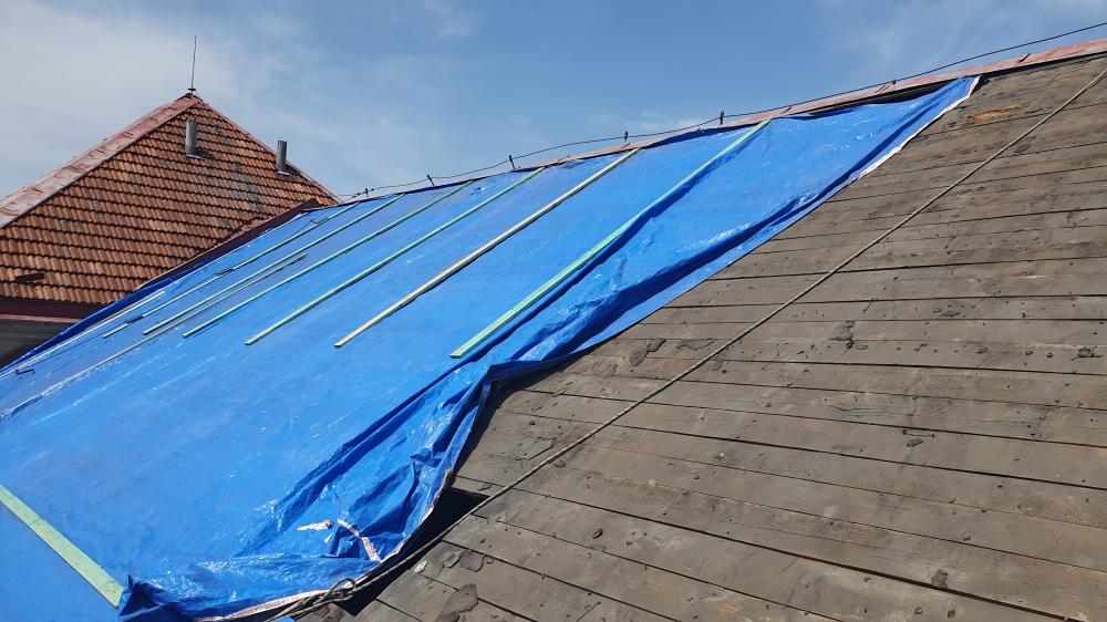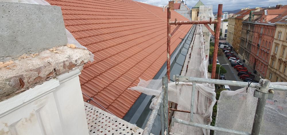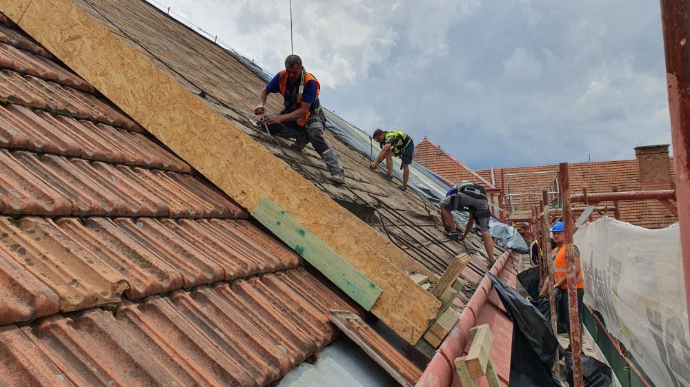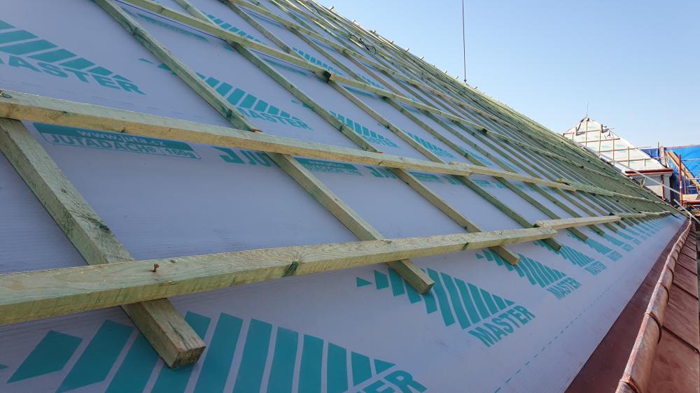 Demontáž krytiny vč. latí a bednění, vyspravení dřevěné konstrukce stávajícího krovu vč. fungicidního nátěru DEKSAN PROFI PLUS, zaklopení krovu prkny tl. 24 mm, montáž difúzní fólie JUTADACH MASTER, kontralatí a latí 60/40 mm, pokládka skládané krytina TONDACH Francouzská 14 režná.