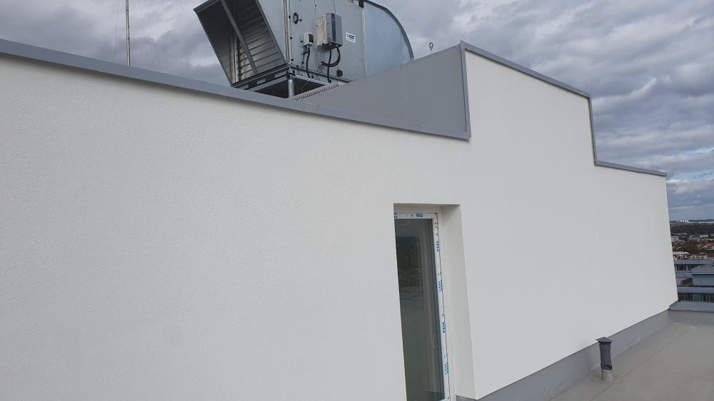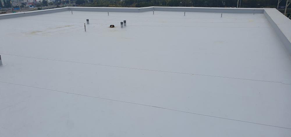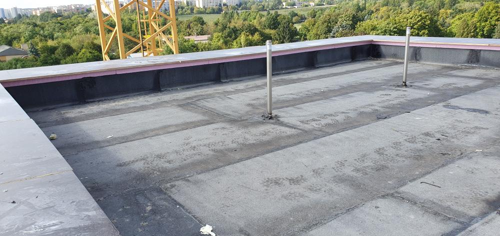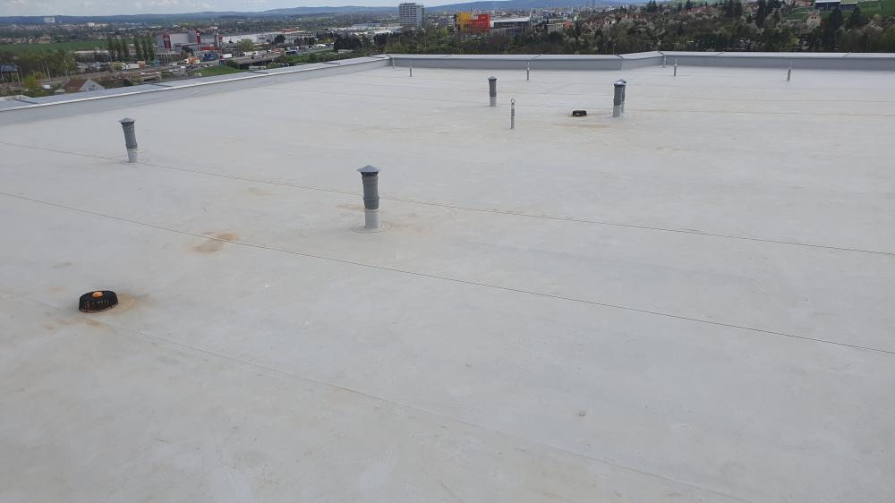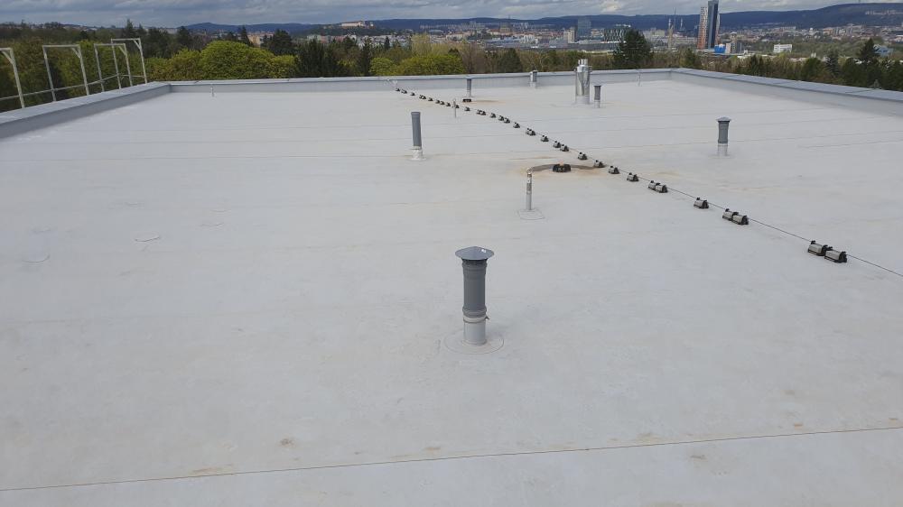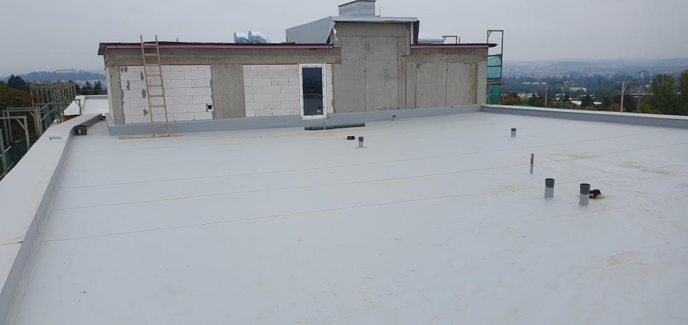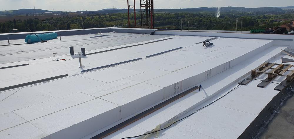 Provedení parotěsné zábrany z SBS modifikovaného asfaltového pásu ELASTOBIT RADON AL 4, položení tepelné izolace ze spádových klínů z polystyrenu EPS 100 a z rovných desek EPS 150, pokládka hydroizolační fólie z mPVC DEKPLAN 76 tl. 1,5 mm vč. separační geotextílie FILTEK 300 g/m2.