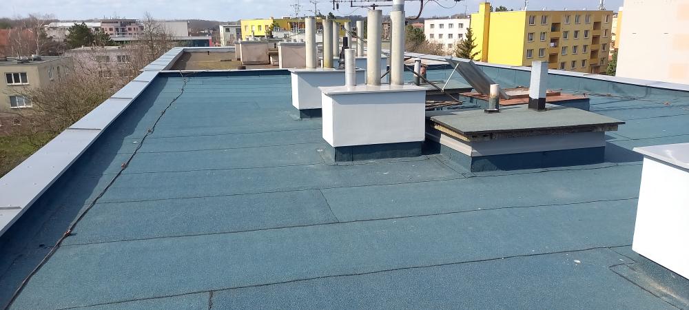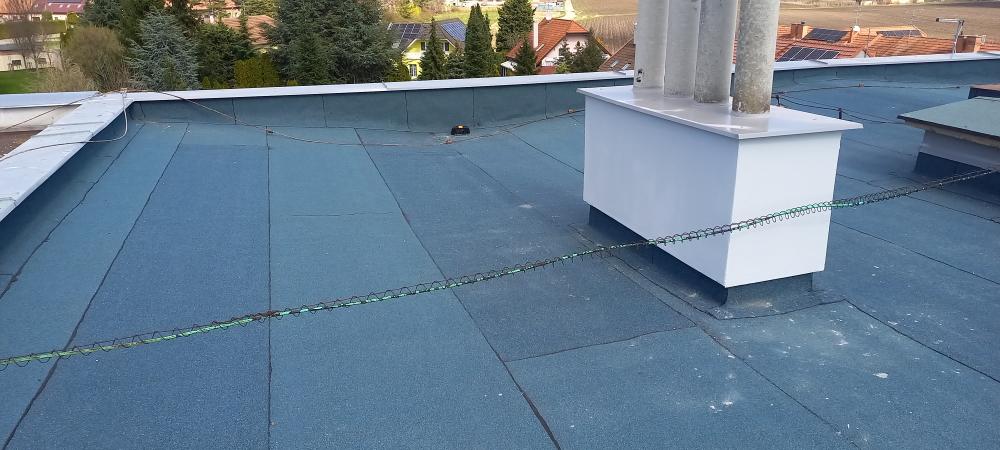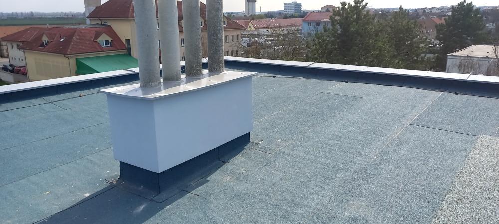 Rekonstrukce střešního pláště natavením SBS modifikovaného asfaltového pásu ELASTEK 40 SPECIAL DEKOR modrozelený vč. vyspravení komínových těles a oplechování atiky z barevného plechu KJG.