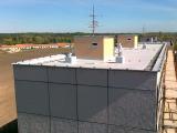 Pokládka tepelné izolace z pěnového polystyrenu EPS 100 S tl. 100 mm a tl. 80 mm s posunutím spár. Pokládka separační vrstvy z polypropylenových vláken FILTEK 300 g/m2 a provedení povlakové hydroizolace z PVC fólie DACHPLAN tl. 1,5 mm. Stabilizace střešního pláště kotvením šrouby GBST 6x90 + teleskop 165. Součástí dodávky bylo i nadezdění ventilačních šachet, výměna stávajících odvětrávacích hlavic za samoodtahové ventilační turbíny Lomanco BIB 14, výměna odvětrání kanalizace a provedení klempířských prvků z plechu Viplanyl a Lindab.