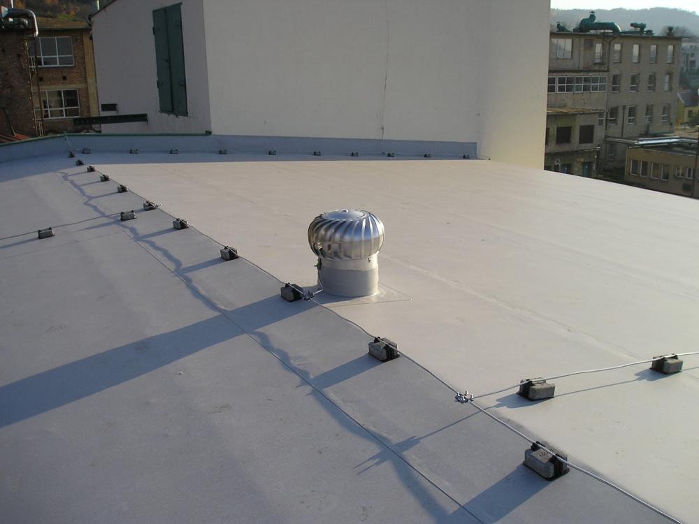 Provedena oprava střech celkem na čtyř objektech. Fotografie jsou z objektu budova č. 4, kde se provedl na stávající střešní plášť nový, čímž vzikla dvouplášťová střecha - stávající plochá střecha a nová selová střecha se sklonem 10°. Nosnou konstrukci nového střešního pláště tvořily vazníky GANG-NAIL, na které se přikotvily hranoly po vlašsku a provedl záklop z desek tl. 25 mmm. Na záklop byla položena separační vrstva z polypropylenové textílie FILTEK 300 g/m2 a povlaková hydroizolace z PVC fólie ALKORPLAN 35176 tl. 1,5 mm. Stabilizace střešního pláště kotvením šrouby TKR 4,8x35 + podložka HTV-82/40TK do záklopu. Provedení klempířských prvků z plechu Viplanyl, Pz a trapézového plechu ROVA, kterým byl opláštěn štít nové sedlové střechy. Dodávka a montáž nové hromosvodové sítě v úrovni střechy vč. revizní zprávy.